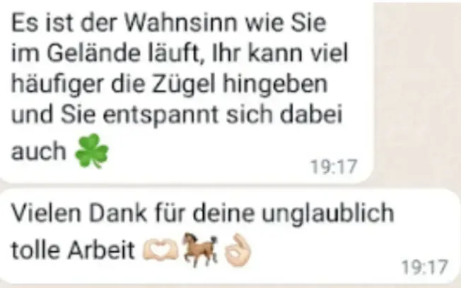 Ein unschlagbarer Vorteil für meine Schülerinnen ist auch, dass sie das Wissen im Format des Onlinekurses viel günstiger bekommen, als wenn sie meine Zeit bezahlen würde, die ich auf dem Reitplatz stehe und ihnen die Theorie erkläre.